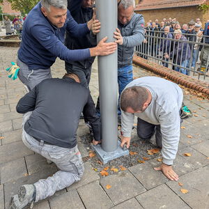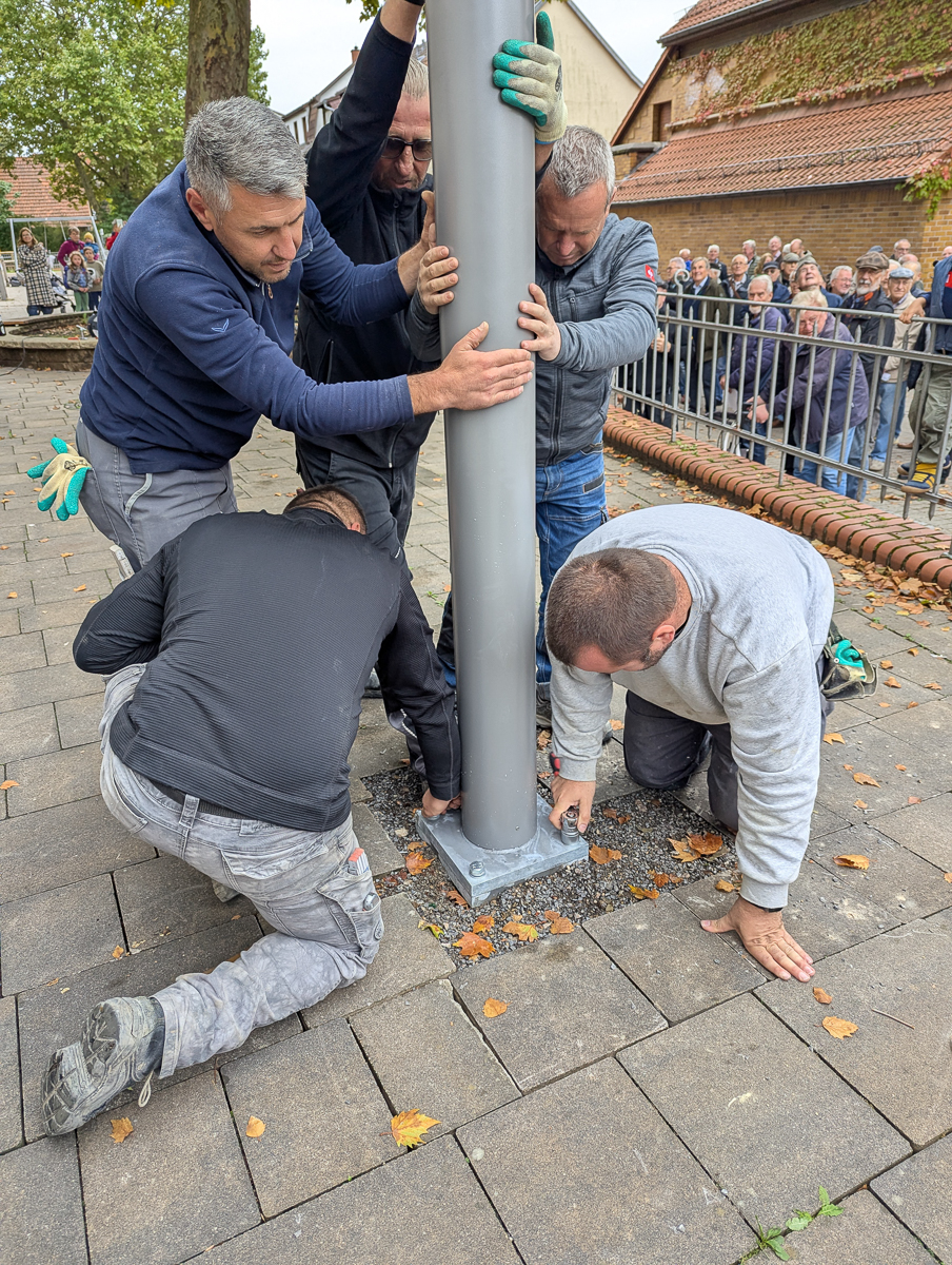 Als sich am Freitag, 26.September 2025 eine größere Anzahl Menschen vor der Eichendorffschule versammelte, darunter die Sänger des Liederkranz, bedurfte es keiner künstlichen Intelligenz zu erkennen, was da los war: der neue Rohrbacher Maibaum wurde gestellt. Dazu packten kräftige Männer an, kräftige Männerstimmen begleiteten das Ganze und Frauen packten ebenfalls kräftig mit an.