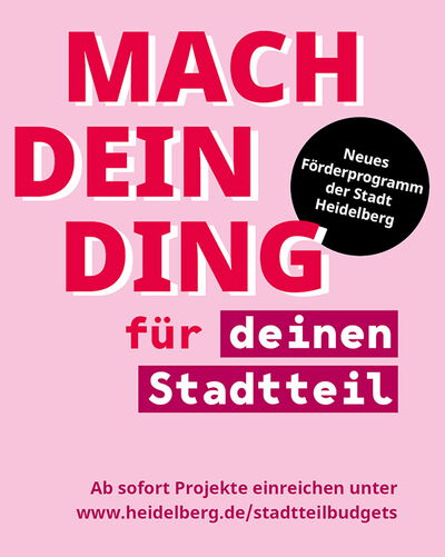 Aufgrund der Finanznöte der Stadt Heidelberg, war es einige Monate nicht möglich, Mittel aus den Stadtteilbudgets zu beantragen. Nun wurde der Topf wieder freigegeben und es ist wieder, wenn auch mit stark reduzierten Mitteln, möglich, finanzielle Unterstützung für die Umsetzung eigener Ideen und Projekte im Quartier zu erhalten. Mit den Stadtteilbudgets stehen – von bestehenden Förderungen unabhängige - Fördertöpfe bereit, die für bürgerschaftliche Projekte mit Stadtteilbezug verwendet werden können. Wer ein Projekt umsetzen möchte, kann ab sofort wieder online unter www.heidelberg.de/stadtteilbudgets einen Antrag auf Förderung stellen. Dort sind auch weitere Informationen zu finden.
