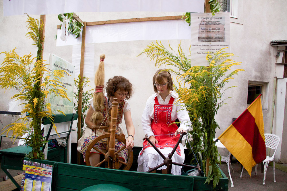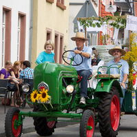 Dann kam der Kerwezug. Erstmals angeführt von unserem Ehrenvorsitzenden Bernd Frauenfeld. Und mit einem wunderbar geschmückten Wagen hinter dem roten Ferraritraktor, auf dem das Museum bekannte, dass es spinnt. Mit Wolle, versteht sich. Und das Ganze noch mit einer Live-Vorführung von Hannah Dziobek und Almut Bakowski.